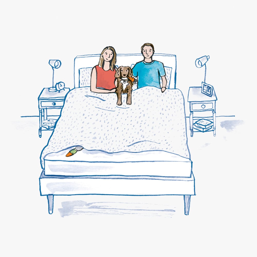 A colour illustration of youself, your partner and your pet. Options for additional family members. A simple setting surround - a room or outside space.